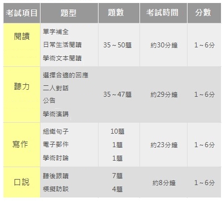 此外,考試成績採用全新1–6級分制(每0.5分為一級),更直觀地對應CEFR歐洲語言共同參考架構,讓成績更容易理解與國際比較。每個部分(閱讀、聽力、寫作、口說)獨立給予1–6分,整體總分為四部分平均值,四捨五入至最近的0.5分(例如平均5.25分 → 總分5.5分)。